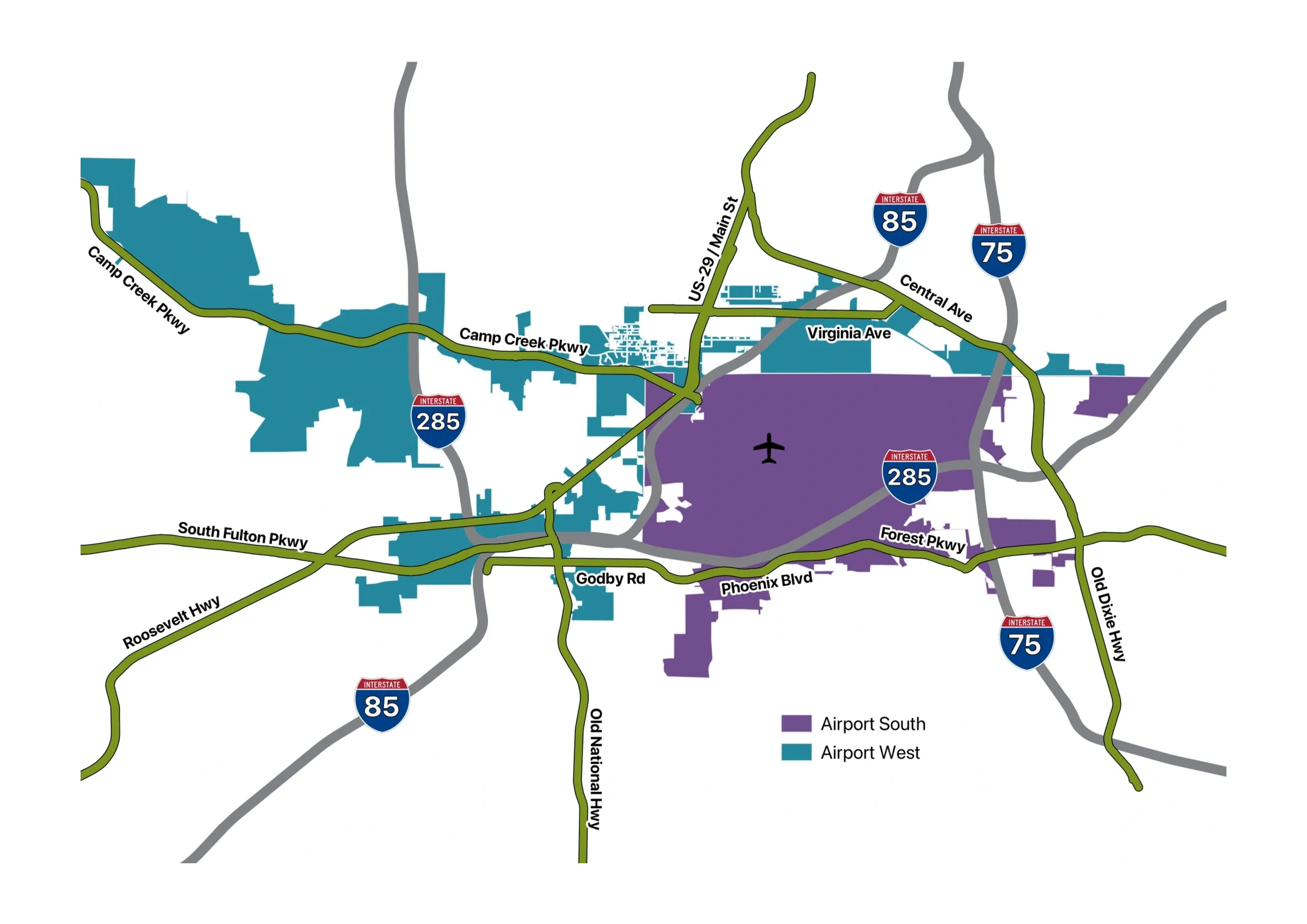 The ATL Airport Community Improvement Districts (AACIDs) are comprised of the Airport West Community Improvement District (AWCID) and the Airport South Community Improvement District (ASCID). AWCID, located in Fulton County, encompasses portions of the City of Atlanta, City of College Park, City of East Point, City of Hapeville, and Cit